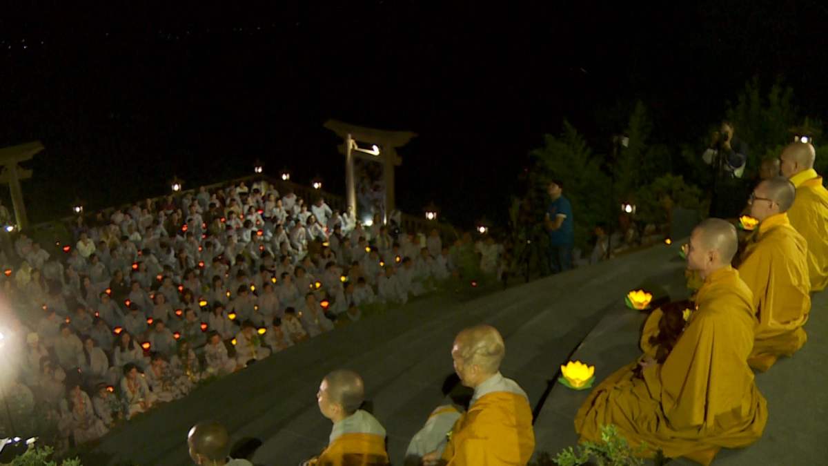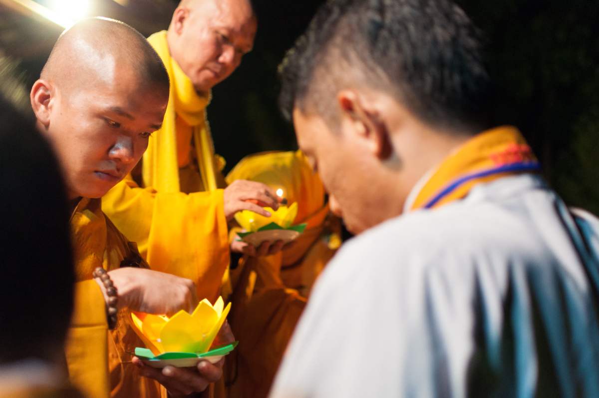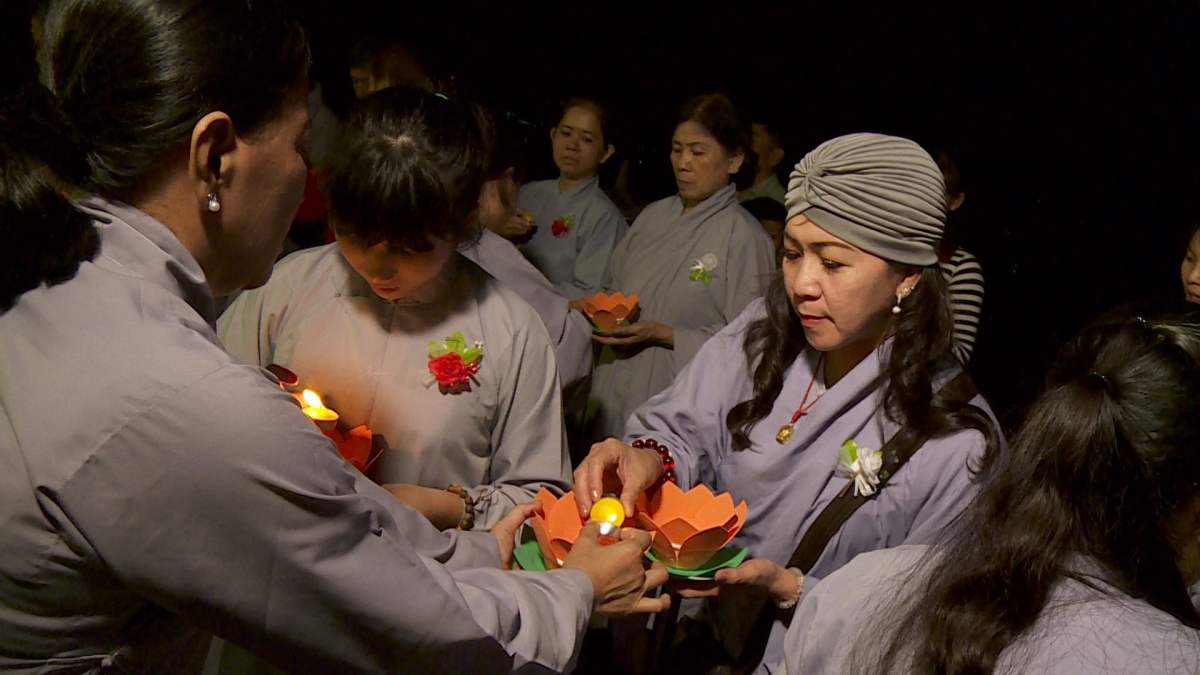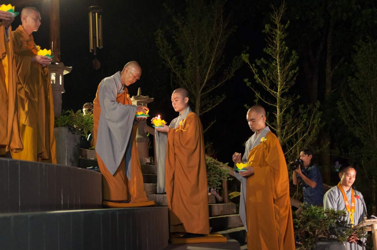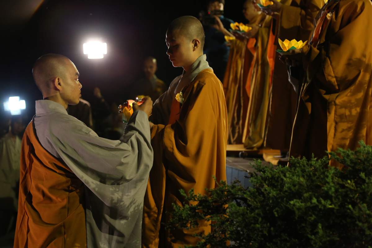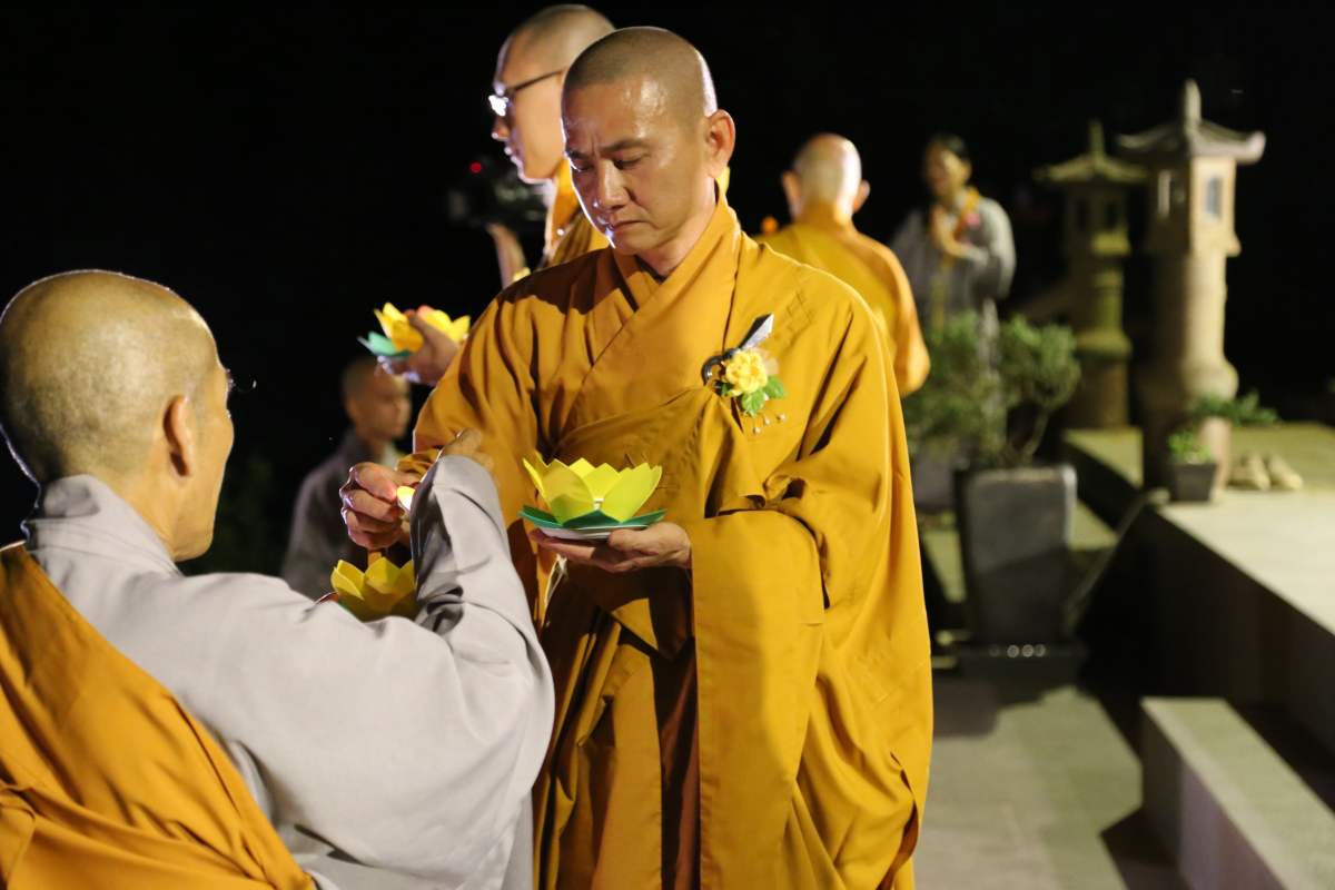 Sau nghi lễ cài hoa hồng là nghi thức dâng đèn hoa đăng với ý nghĩa thắp sáng niềm tin vào ba ngôi Tam bảo. Cầu cho quốc thái dân an, tri ân công sanh thành dưỡng dục của cha và mẹ. Những ngọn đèn mang lại ánh sáng ấm áp, xua tan đi những oan khiên, hận thù, bước theo con đường giải thoát của Như lai.