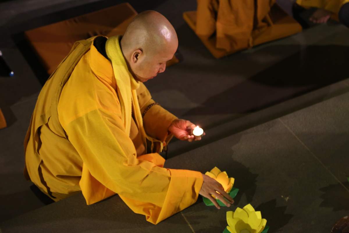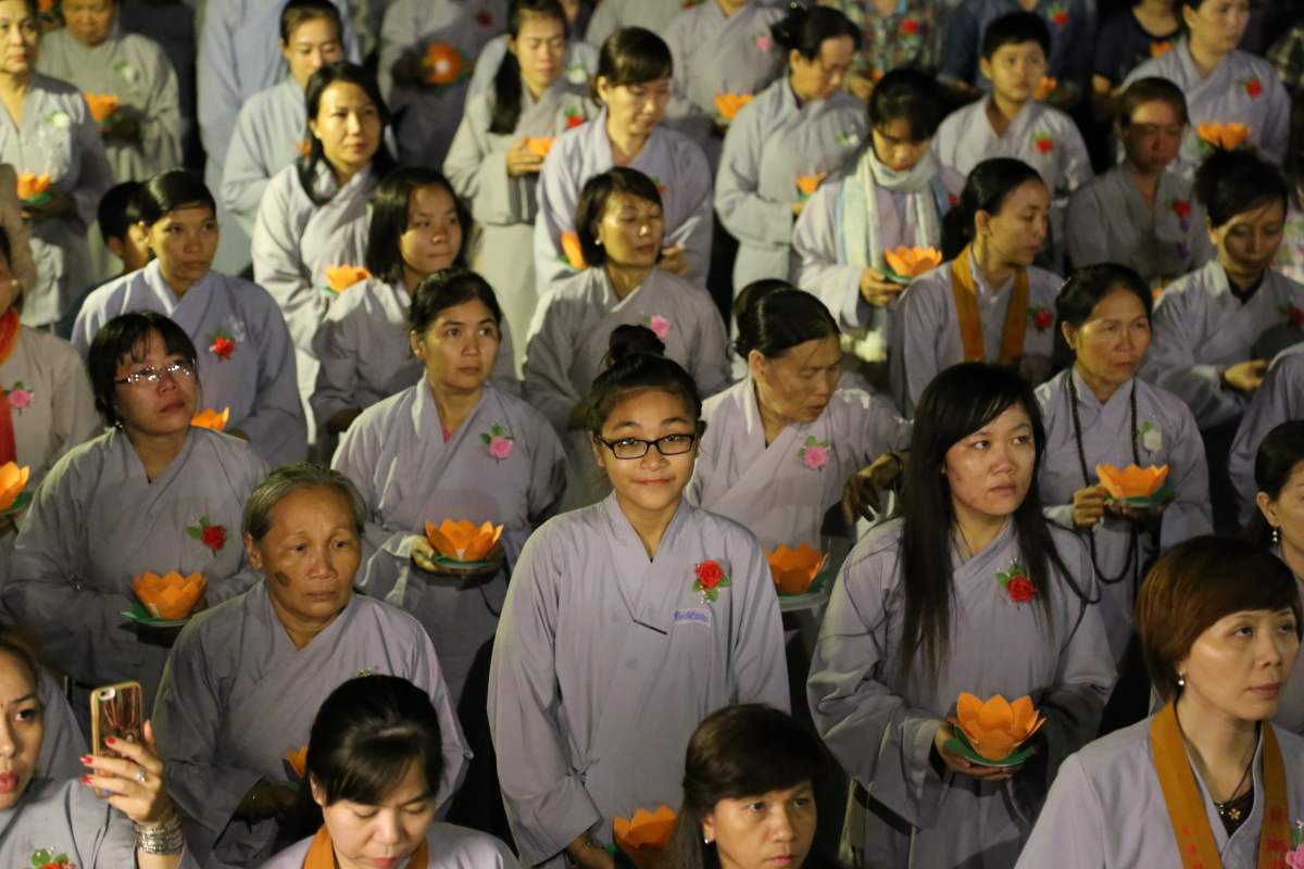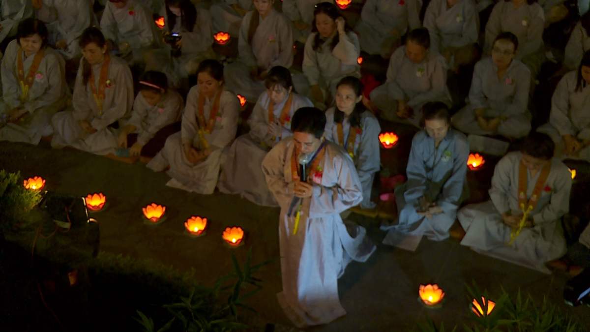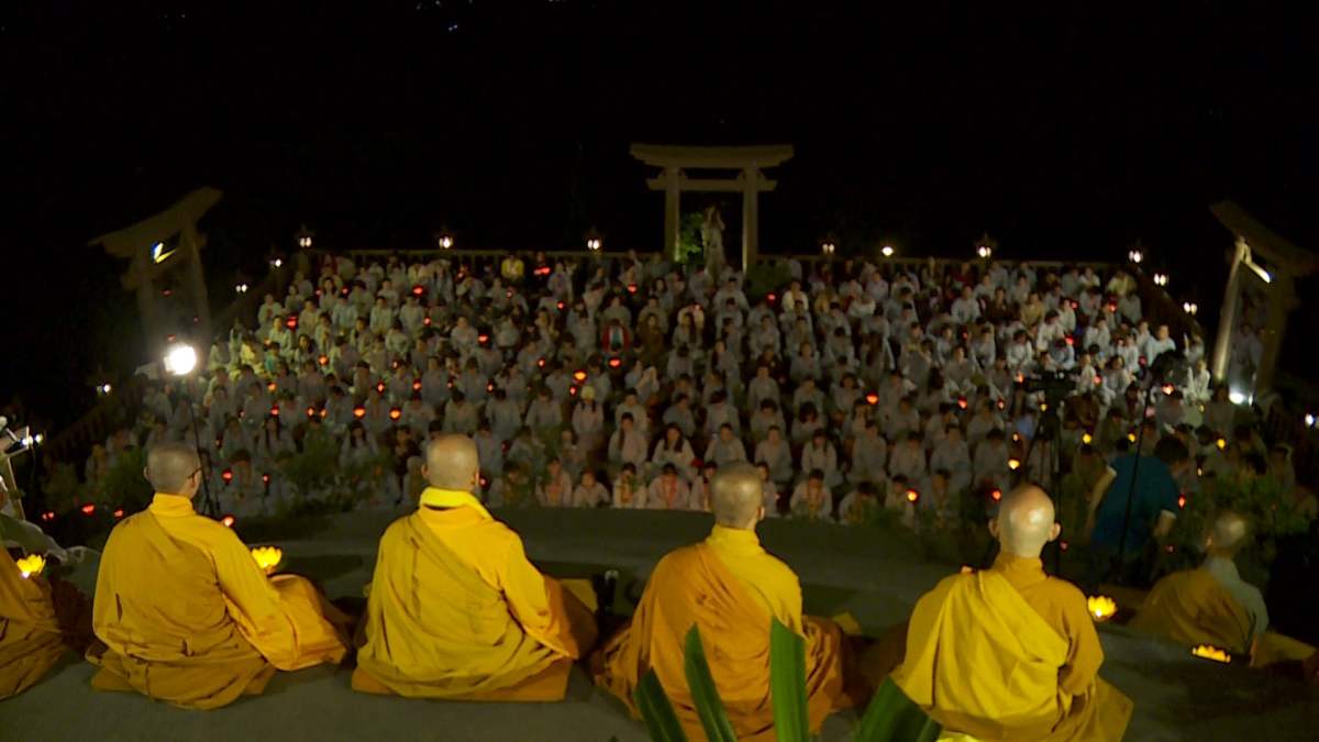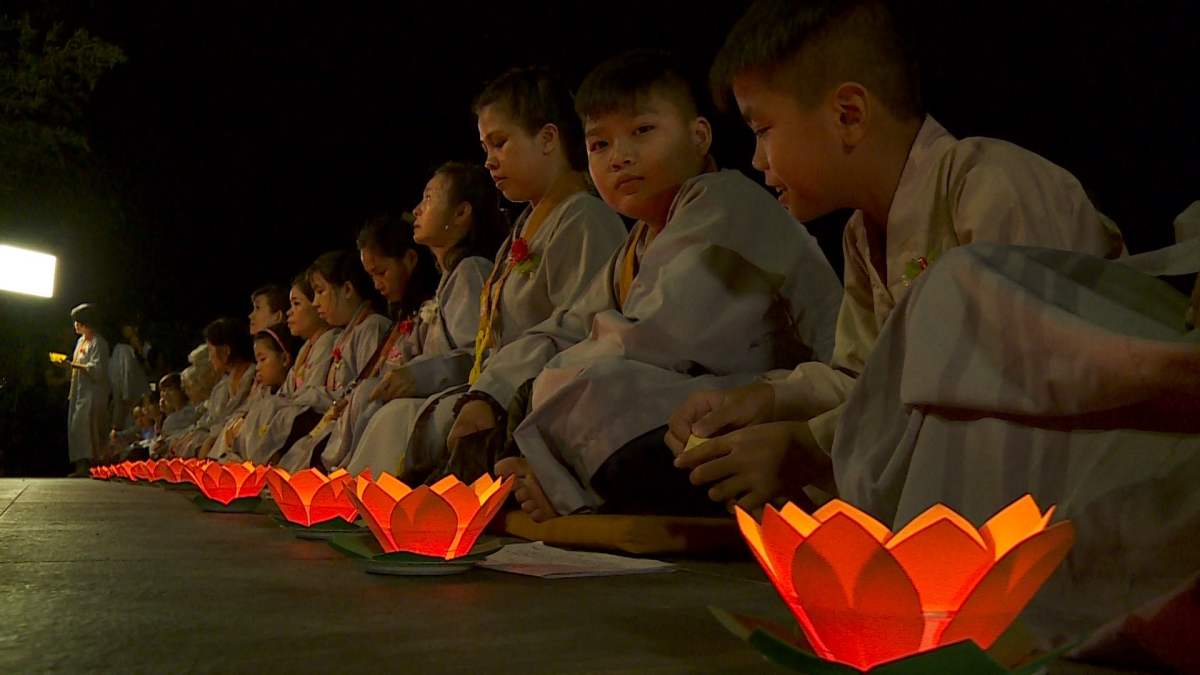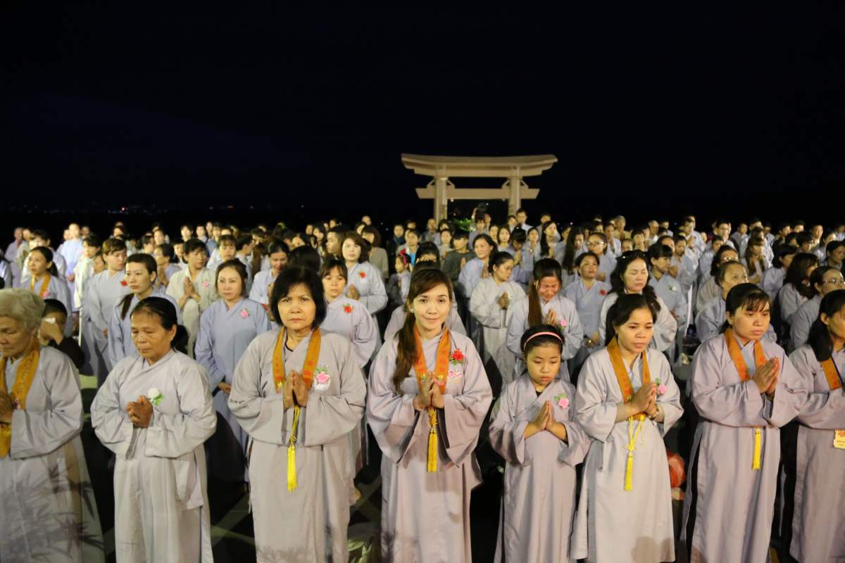 Sau nghi lễ cài hoa hồng là nghi thức dâng đèn hoa đăng với ý nghĩa thắp sáng niềm tin vào ba ngôi Tam bảo. Cầu cho quốc thái dân an, tri ân công sanh thành dưỡng dục của cha và mẹ. Những ngọn đèn mang lại ánh sáng ấm áp, xua tan đi những oan khiên, hận thù, bước theo con đường giải thoát của Như lai.