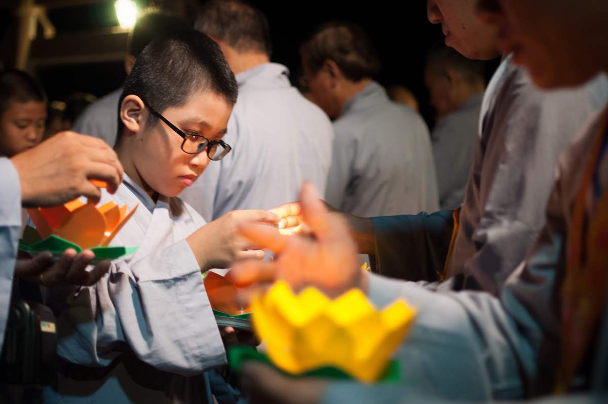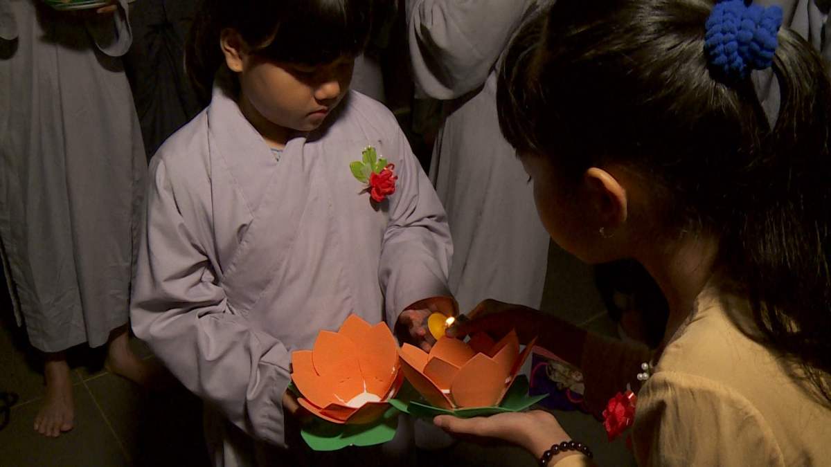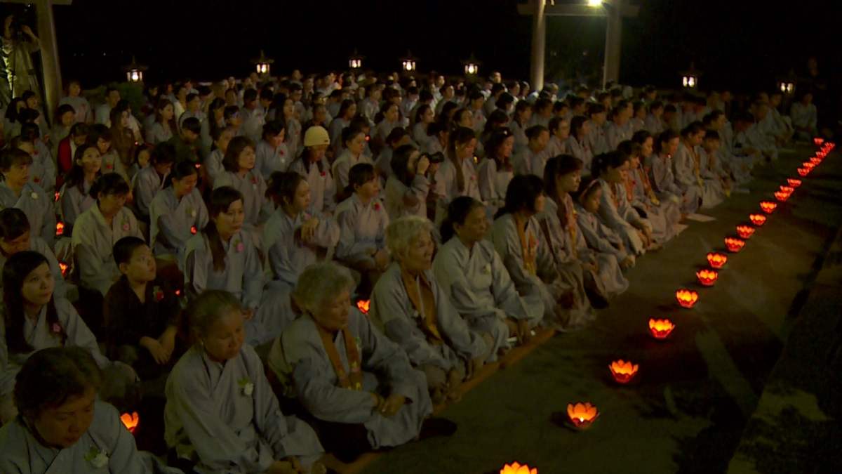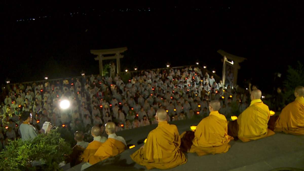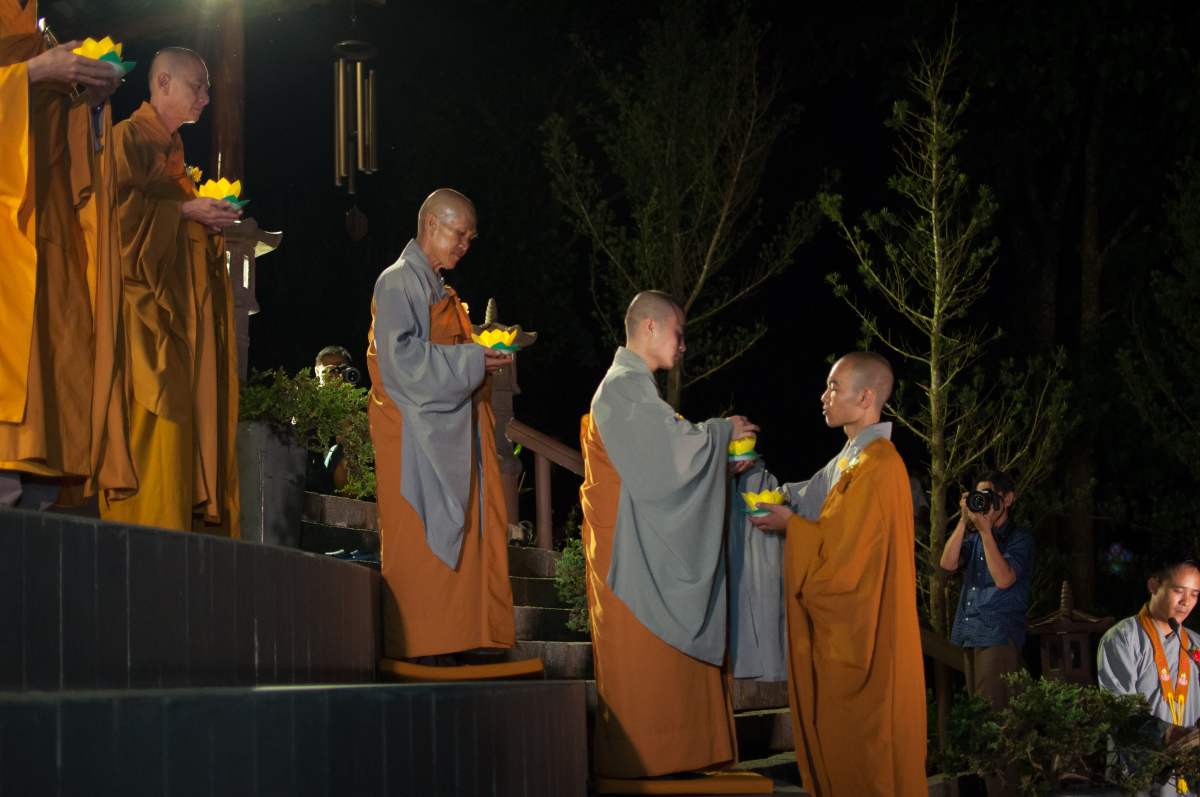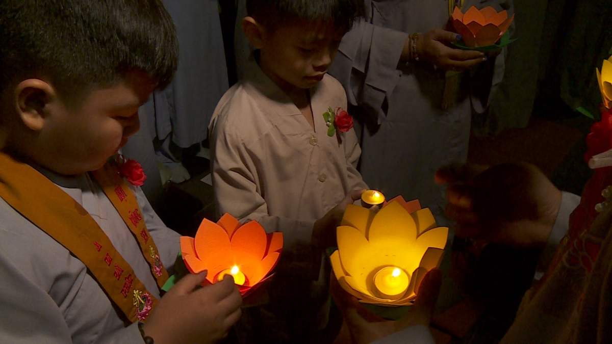 Sau nghi lễ cài hoa hồng là nghi thức dâng đèn hoa đăng với ý nghĩa thắp sáng niềm tin vào ba ngôi Tam bảo. Cầu cho quốc thái dân an, tri ân công sanh thành dưỡng dục của cha và mẹ. Những ngọn đèn mang lại ánh sáng ấm áp, xua tan đi những oan khiên, hận thù, bước theo con đường giải thoát của Như lai.