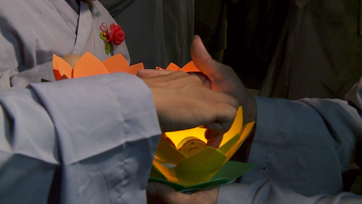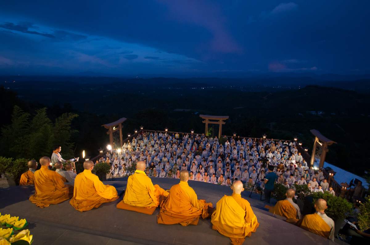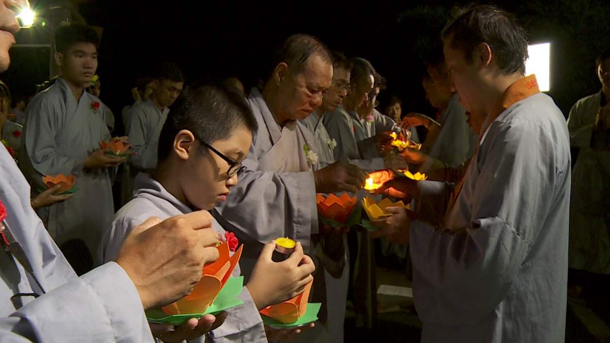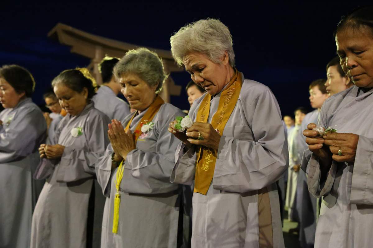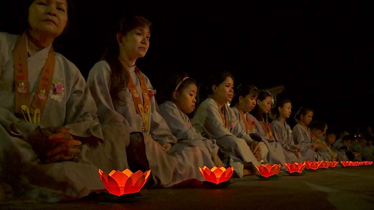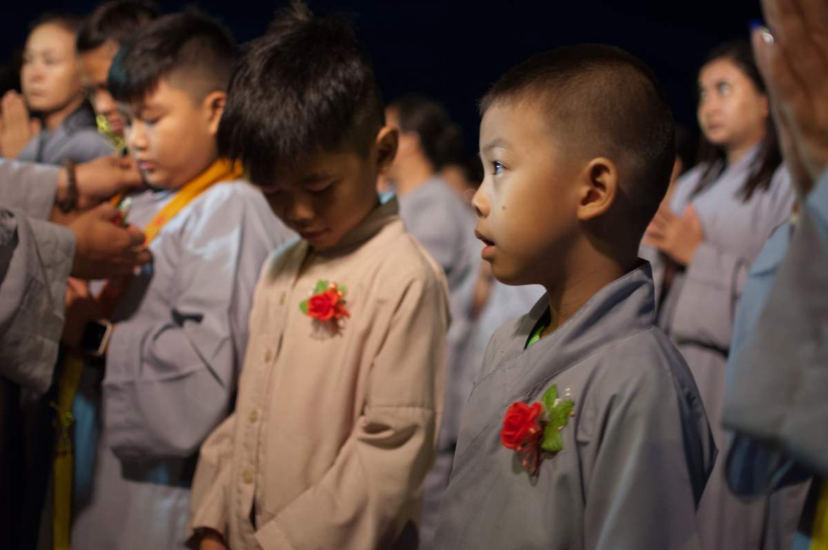 Sau nghi lễ cài hoa hồng là nghi thức dâng đèn hoa đăng với ý nghĩa thắp sáng niềm tin vào ba ngôi Tam bảo. Cầu cho quốc thái dân an, tri ân công sanh thành dưỡng dục của cha và mẹ. Những ngọn đèn mang lại ánh sáng ấm áp, xua tan đi những oan khiên, hận thù, bước theo con đường giải thoát của Như lai.